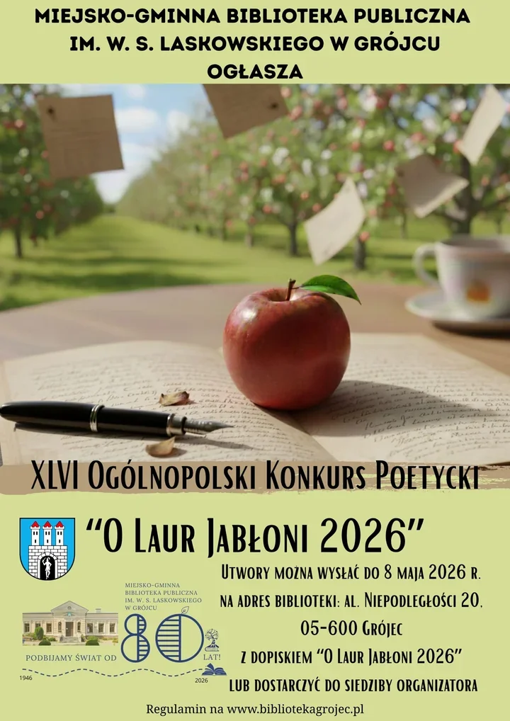 Grójecka biblioteka znów otwiera przestrzeń dla nieoczywistej poezji - to propozycja dla tych, którzy lubią pisać między wersami i chcą zmierzyć się z ogólnopolską sceną. W tym roku Miejsko-Gminna Biblioteka Publiczna im. W. S. Laskowskiego w Grójcu ponownie zaprasza autorów do udziału w konkursie „O Laur Jabłoni”.
